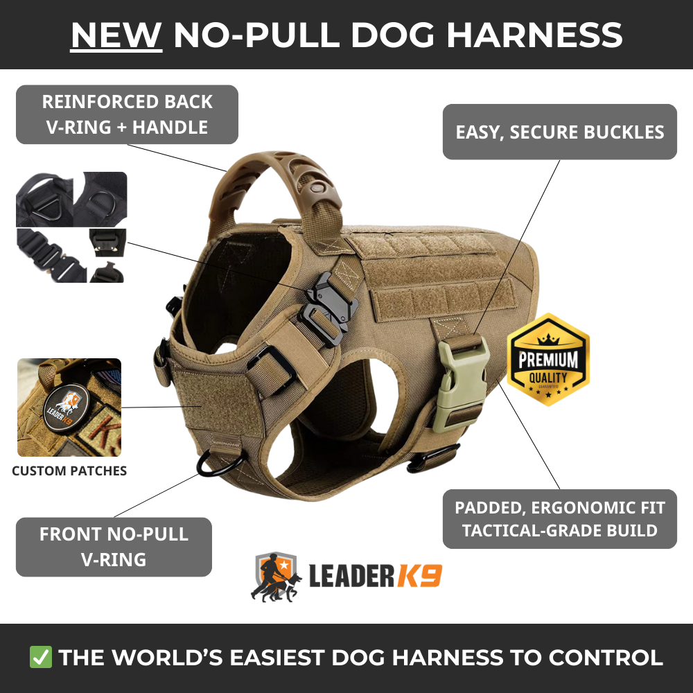The Leader K9 No-Pull Tactical Dog Harnessdelivers true no-pull (front D-ring), an assist handle, metal hardware, and 360° reflective trim—built for more control, more safety, faster handling.